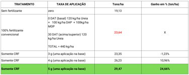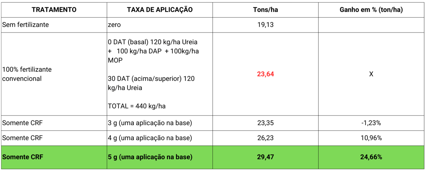 O CRF nas dosagens de 4g e 5g/planta apresentou uma vantagem relativa de 10,9% e 24,7% em relação às parcelas tratadas com fertilizante convencional, em termos de produtividade estimada por hectare na Vila Bhiskuri.
