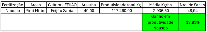 Eficiência da produtividade do feijão após tratamento com fertilizante de liberação controlada Nousbo no Brasil, resultando em um ganho de 13,81%