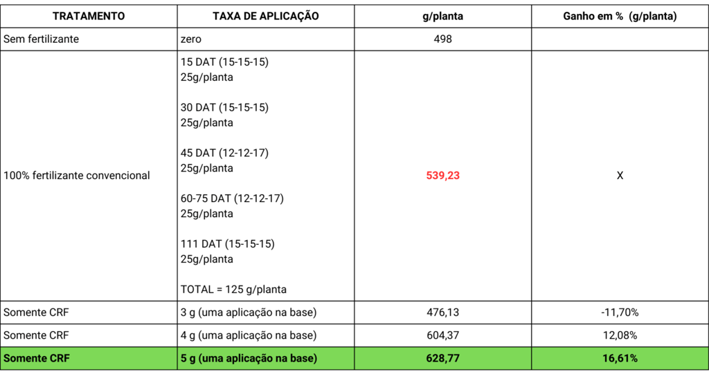 Para ambos os locais, a eficiência do CRF 21-6-10 foi testada utilizando os seguintes tratamentos: Controle (sem fertilizante), Dose Recomendada de Fertilizante Convencional e CRF com doses de 3, 4 e 5 g/planta. Os dados de crescimento e desenvolvimento foram registrados pela avaliação da altura da planta 61 dias após o transplante e da produtividade total por planta na colheita. Os valores de SPAD (Soil Plant Analysis Development), que refletem o teor aproximado de nitrogênio, foram coletados 61 dias após o transplante. Os resultados estão resumidos na tabela a seguir.