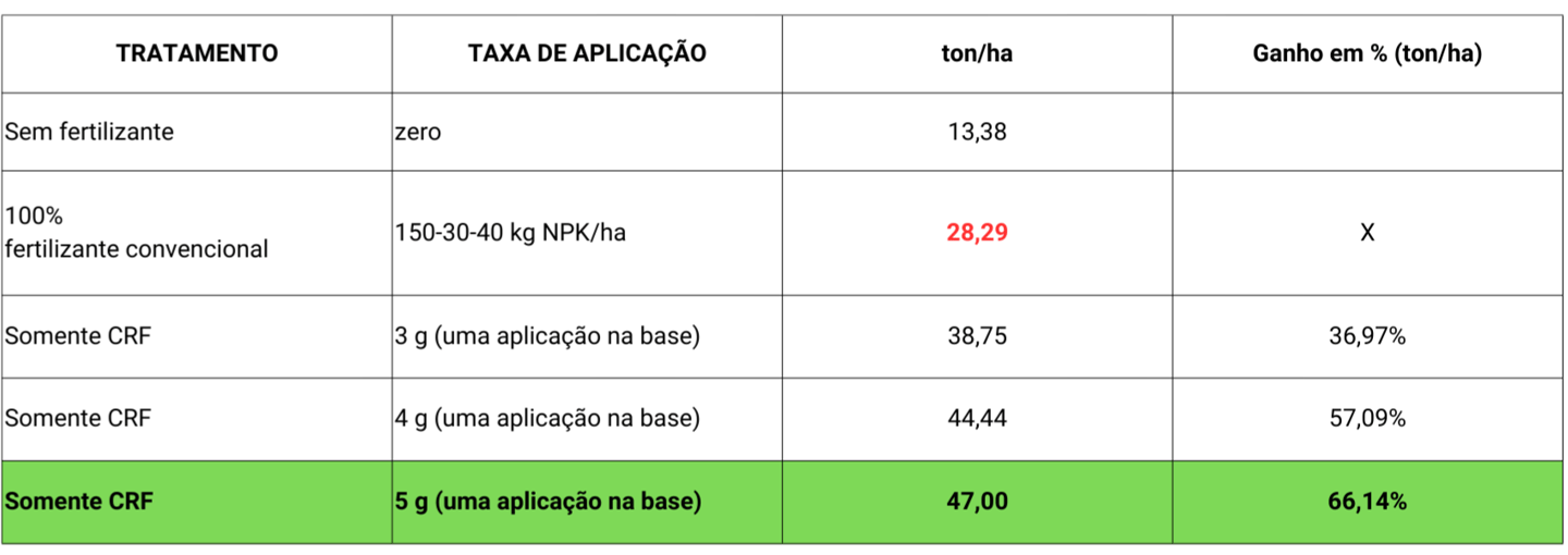 A dose recomendada de fertilizante convencional foi aplicada com base na recomendação da análise de solo, na proporção de 150-30-40 kg de N-P₂O₅-K₂O por hectare em Barangay e 150-40-60 kg de N-P₂O₅-K₂O por hectare em Barangay, Nueva Ecija, aplicados como adubação de base e cobertura. As fontes de fertilizantes inorgânicos utilizadas foram: fertilizante completo 14-14-14, ureia 46-0-0 e cloreto de potássio (muriato de potássio). O CRF 26-5-12 foi aplicado uma única vez como adubação de base, por meio de semeadura direta (dibbling). Os seguintes dados foram coletados: dias até a formação da cabeça, altura da planta (cm) na fase de formação da cabeça, peso médio da cabeça (g) e produtividade estimada (toneladas/hectare). Os resultados estão resumidos na tabela a seguir.